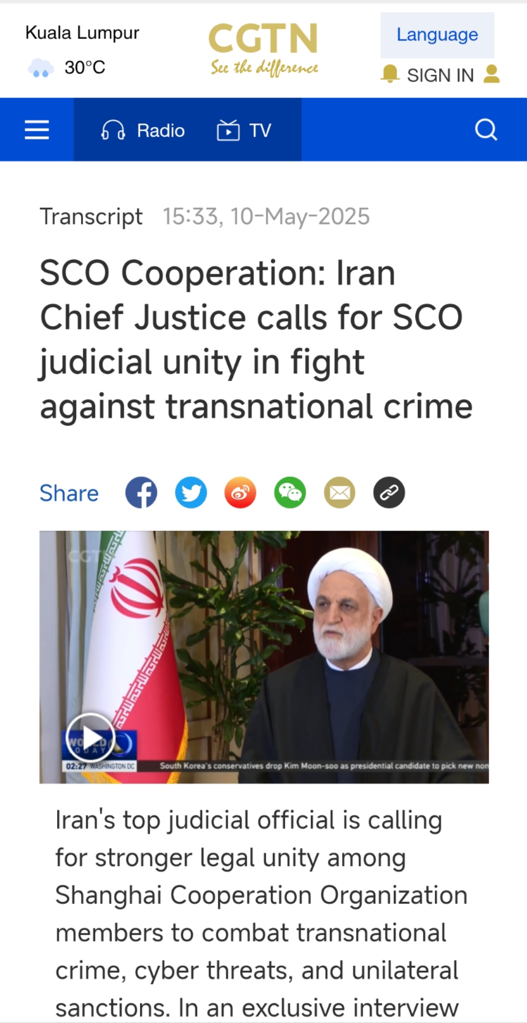 Irans top judicial official is calling for stronger legal unity among Shanghai Cooperation Organization members to combat transnational crime cyber threats and unilateral sanctions. In an exclusive interview with CGTN Irans Chief Justice pledged to share the countrys expertise in judicial innovation and sanctions resistance - framing the SCO as a critical shield against global hegemony.