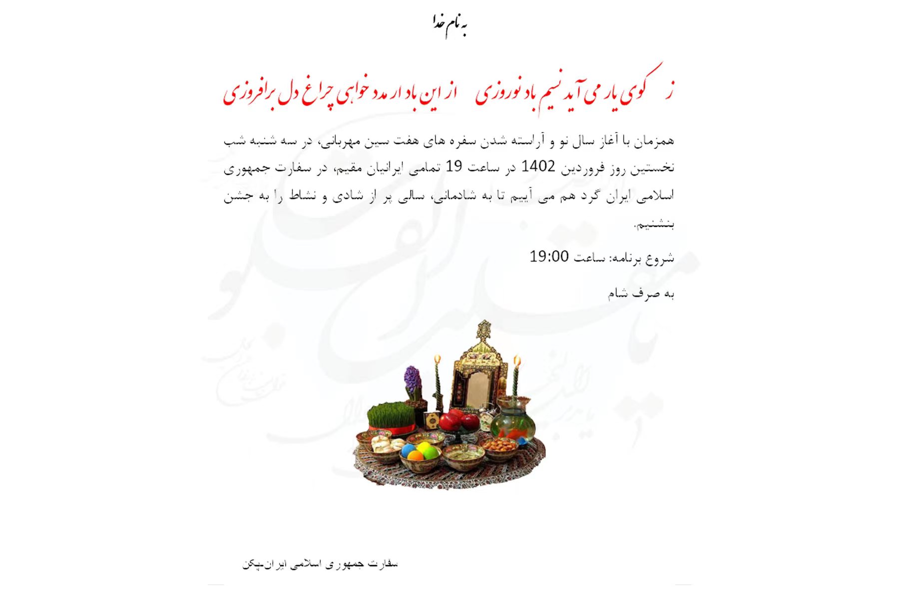 اطلاعیه برگزاری جشن نوروز 1402 در سفارت ج.ا.ایران-پکن