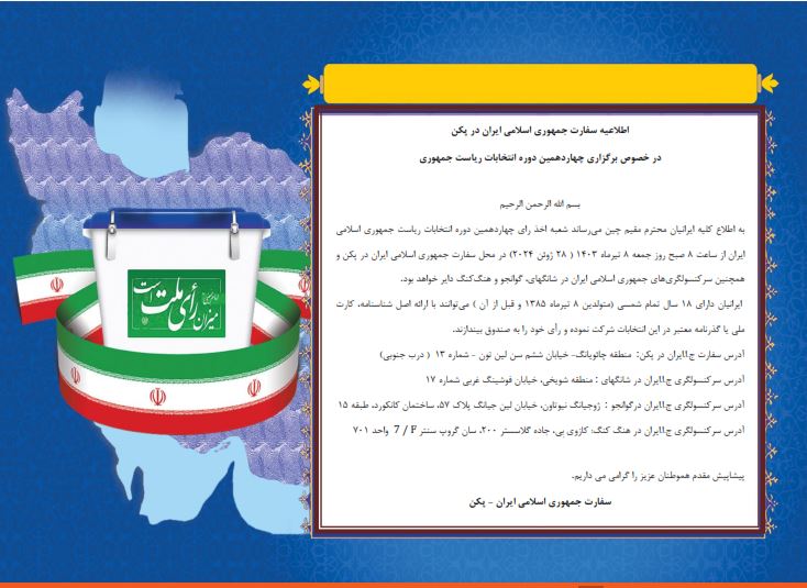 اطلاعیه سفارت جمهوری اسلامی ایران در پکن در خصوص برگزاری چهاردهمین دوره انتخابات ریاست جمهوری