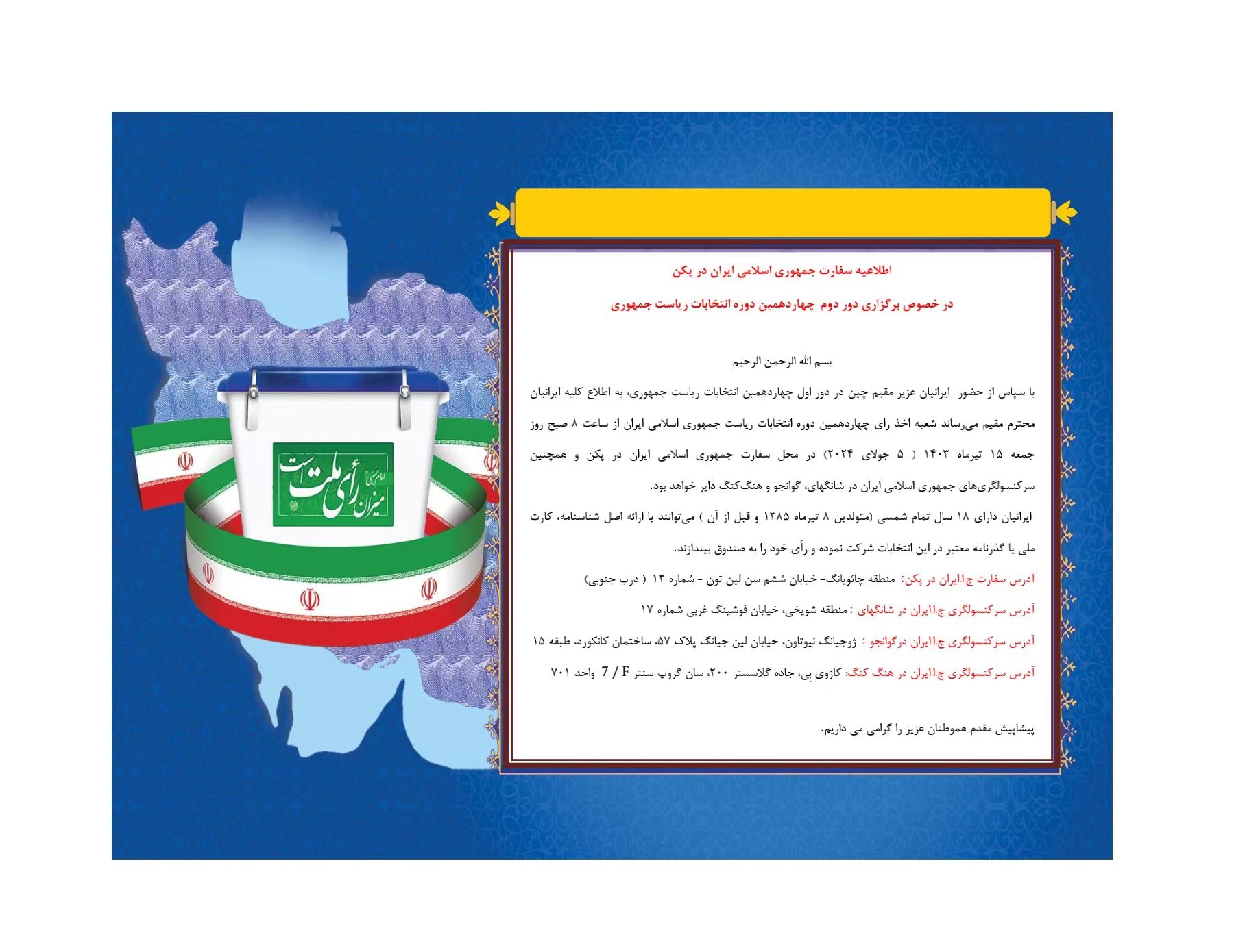 با سپاس از حضور ایرانیان عزیر مقیم چین در دور اول چهاردهمین انتخابات ریاست جمهوری، به اطلاع کلیه ایرانیان محترم مقیم می‌رساند شعبه اخذ رای چهاردهمین دوره انتخابات ریاست جمهوری اسلامی ایران از ساعت ۸ صبح روز جمعه 15 تیرماه ۱۴۰۳ ( 5 جولای ۲۰۲۴) در محل سفارت جمهوری اسلامی ایران در پکن و همچنین سرکنسولگری‌های جمهوری اسلامی ایران در شانگهای، گوانجو و هنگ‌کنگ دایر خواهد بود.